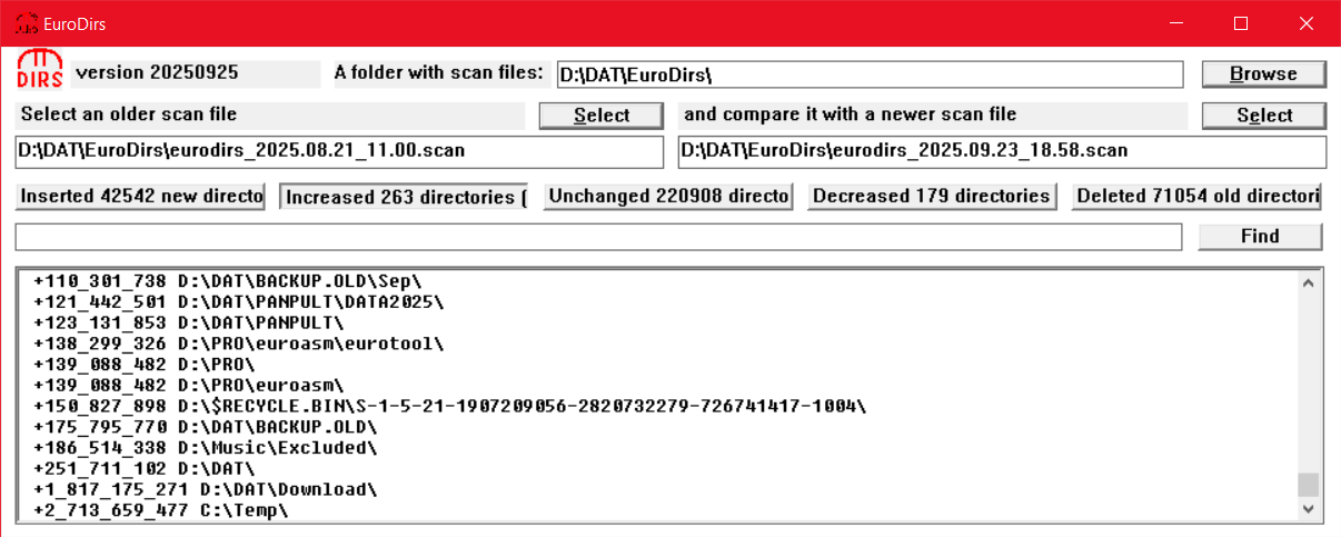 /ScanNow=no) EuroDirs will compare two scan files specified by/InputFileand/OutputFile. By default they are empty; in this case/InputFilewill be assigned with the oldest scan and/OutputFilewith the newest (latest) one.- Size of files from both scans will be compared, files tossed to five categories: increased, decreased, unchanged, inserted, deleted. Each category will be sorted by file size.